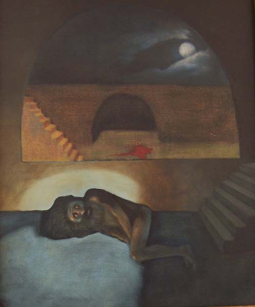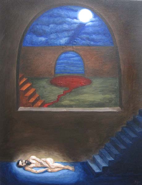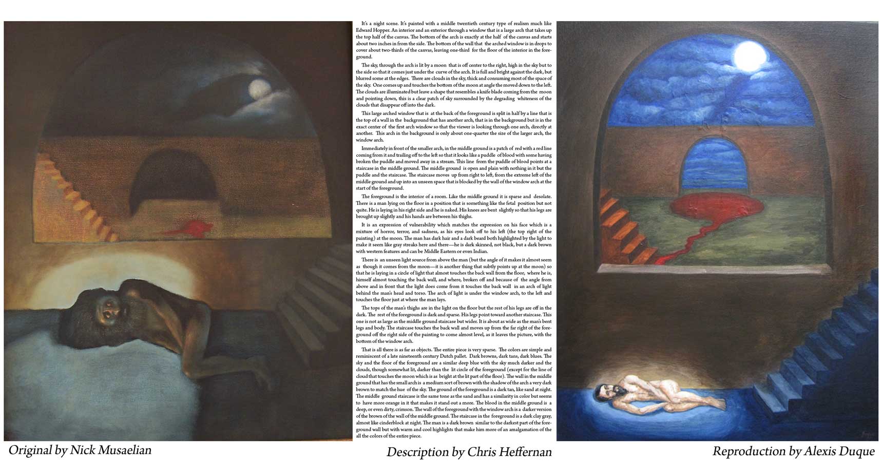 That is all there is as far as objects. The entire piece if very sparse. The colors are simple and reminiscent of a late nineteenth century Dutch pallet. Dark browns, dark tans, dark blues. The sky and the floor of the foreground are a similar deep blue with the sky much darker and the clouds, though somewhat lit, darker than the lit circle of the foreground (except for the line of cloud that touches the moon which is as bright at the lit part of the floor). The wall in the middle ground that has the small arch is a medium sort of brown with the shadow of the arch a very dark brown to match the hue of the sky. The ground of the foreground is a dark tan, like sand at night. The middle ground staircase is the same tone as the sand and has a similarity in color but seems to have more orange in it that makes it stand out a more. The blood in the middle ground is a deep, or even dirty, crimson. The wall of the foreground with the window arch is a darker version of the brown of the wall of the middle ground. The staircase in the foreground is a dark clay gray, almost like cinderblock at night. The man is a dark brown similar to the darkest part of the foreground wall but with warm and cool highlights that make him more of an amalgamation of the all the colors of the entire piece.