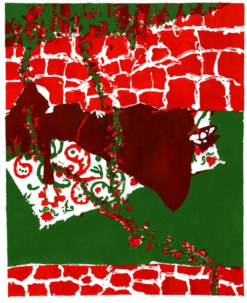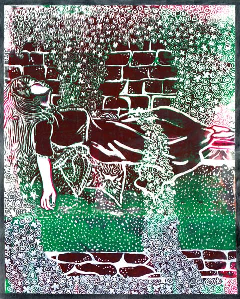 The image ‘Sleeping Beauty’ is a screen print made of 2 impressions – green and red, and a deep brown where they combine. In the background, there’s a stone wall covered with a dense floral creeper covering the top of the picture. The wall is seen behind the woman’s head and behind her thigh and knees.