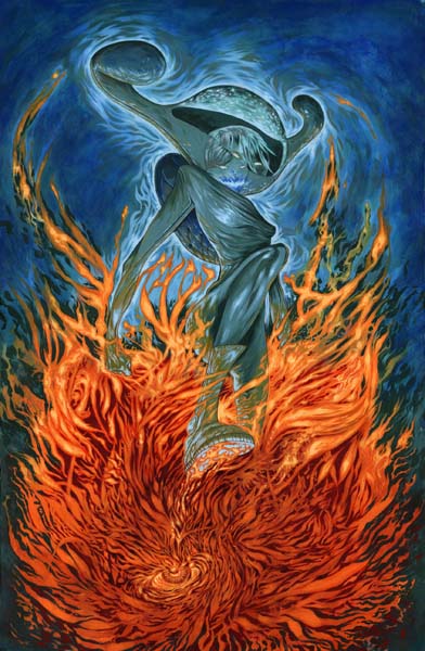 She is facing to the right, defiantly, mostly an aqua color, and it appears as though she's somehow straddling the flame, her right knee jutting out with her foot planted in the middle of the aforementioned fireball as if attempting to squelch it, perhaps, or maybe ride it. Around her lanky body swirls a light blue mist, it seems. Her perky breasts are perhaps an a-cup, and jut outward/upward over her raised knee.