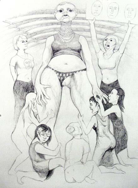 There is a primary figure in the center. A towering female body, muscular and feminine. She stands in the center of twenty five secondary female figures, all young slender sexual creatures...i'll come back to them. The central figure stands over them with clear power. Her legs are naked and exposed, as thick as the torsos of the others. She grips her own thigh with her right hand, fingers spread wide. She wears panties with polka-dots, disheveled, with the crotch pulled to her right side exposing her clean shaven cunt: pillowy and placid, no one is touching it. Her dark wife beater is pulled up enough to show her horizontal innie bellybutton. She has an hourglass figure. Her breasts are not featured, but, from the highlighting, we see that they are present. Her shoulders are bare and lean, but are disproportionate to her legs, which are huge. Her neck is stretched and wrapped like a tribal African, but instead of rings there appears to be beads or pearls tightly forcing her head upwards. Her head is that of a plastic baby doll, expressionless with a million mile stare you never expect to see change.