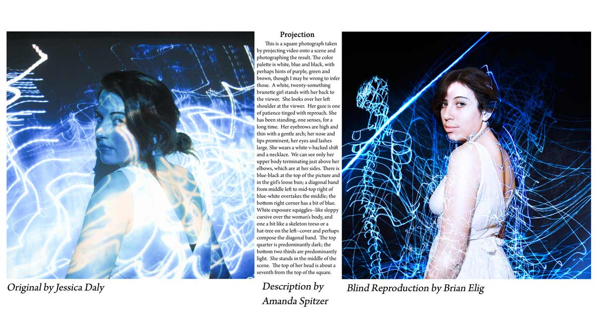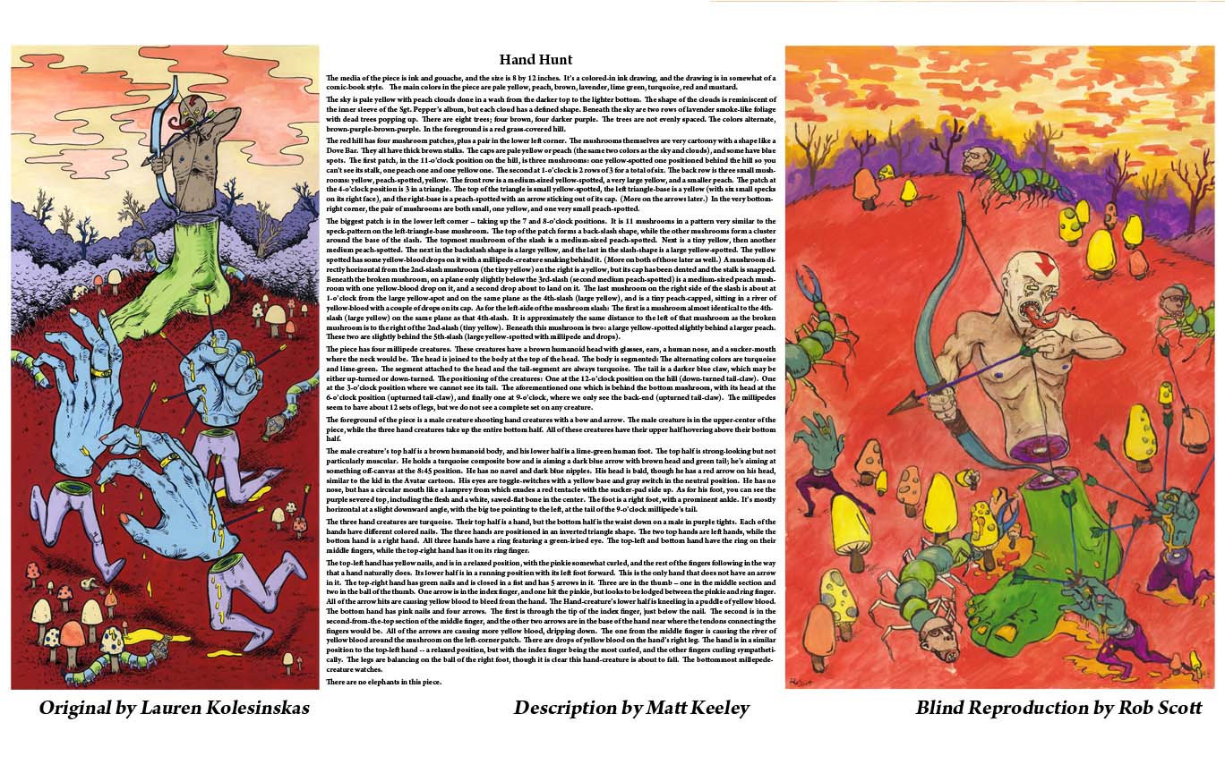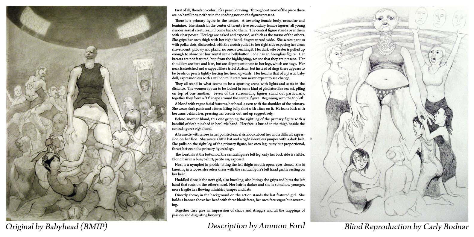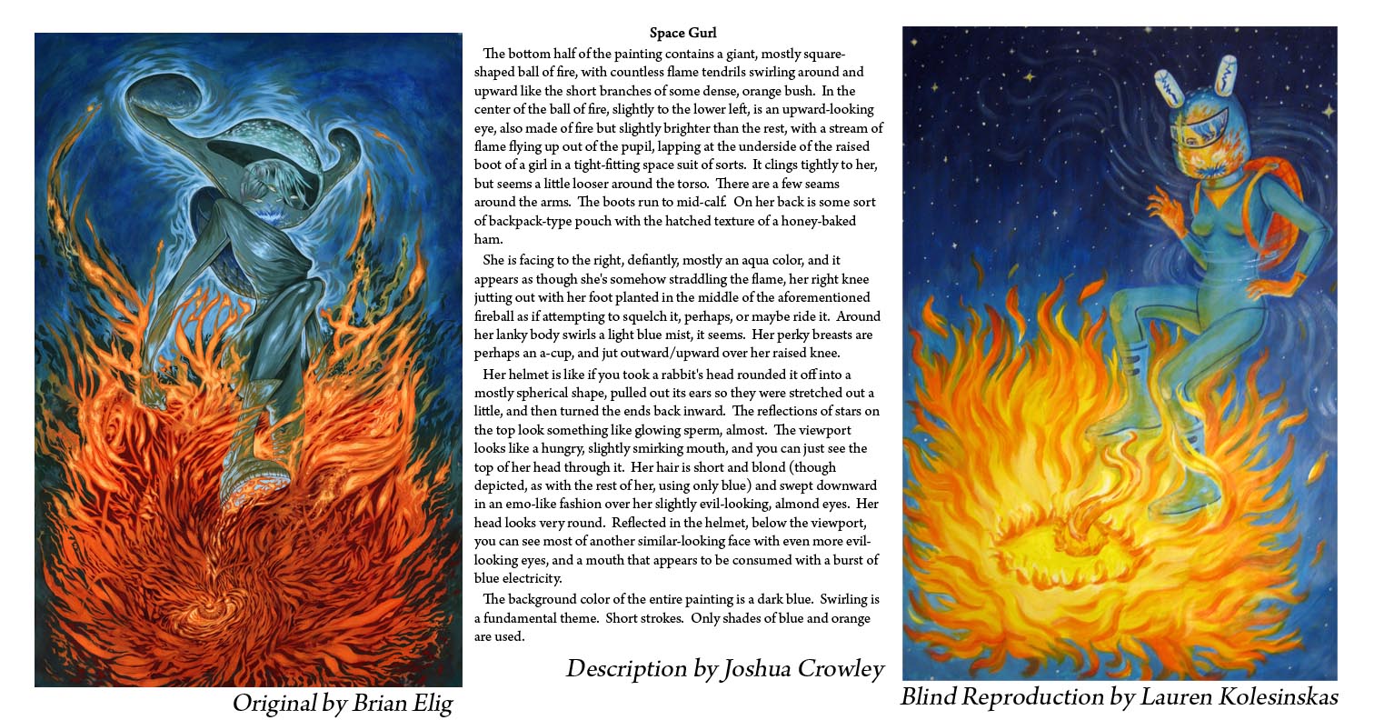 $10,000 Blind Leader: You get to see what happens on another iteration of the process - the willing writers and artists will describe and reproduce one of the reproductions. You also get the whole set of three artworks and two descriptions, as well as the signed catalog, as many prints as you desire, the dinner, and your name at maximum prominence as our Blind Leader.