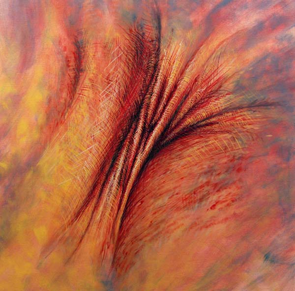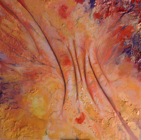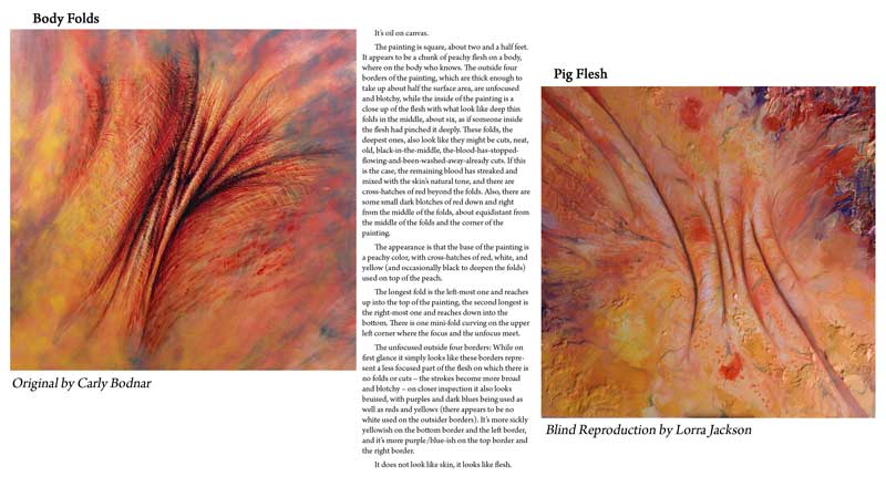 The painting is square, about two and a half feet. It appears to be a chunk of peachy flesh on a body, where on the body who knows. The outside four borders of the painting, which are thick enough to take up about half the surface area, are unfocused and blotchy, while the inside of the painting is a close up of the flesh with what look like deep thin folds in the middle, about six, as if someone inside the flesh had pinched it deeply. These folds, the deepest ones, also look like they might be cuts, neat, old, black-in-the-middle, the-blood-has-stopped-flowing-and-been-washed-away-already cuts. If this is the case, the remaining blood has streaked and mixed with the skin’s natural tone, and there are cross-hatches of red beyond the folds. Also, there are some small dark blotches of red down and right from the middle of the folds, about equidistant from the middle of the folds and the corner of the painting.