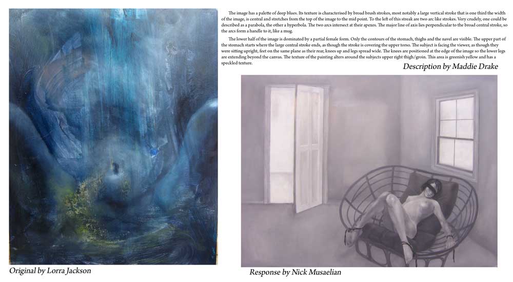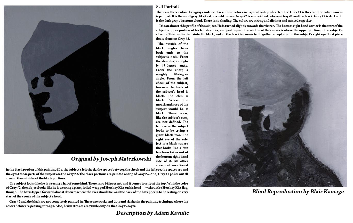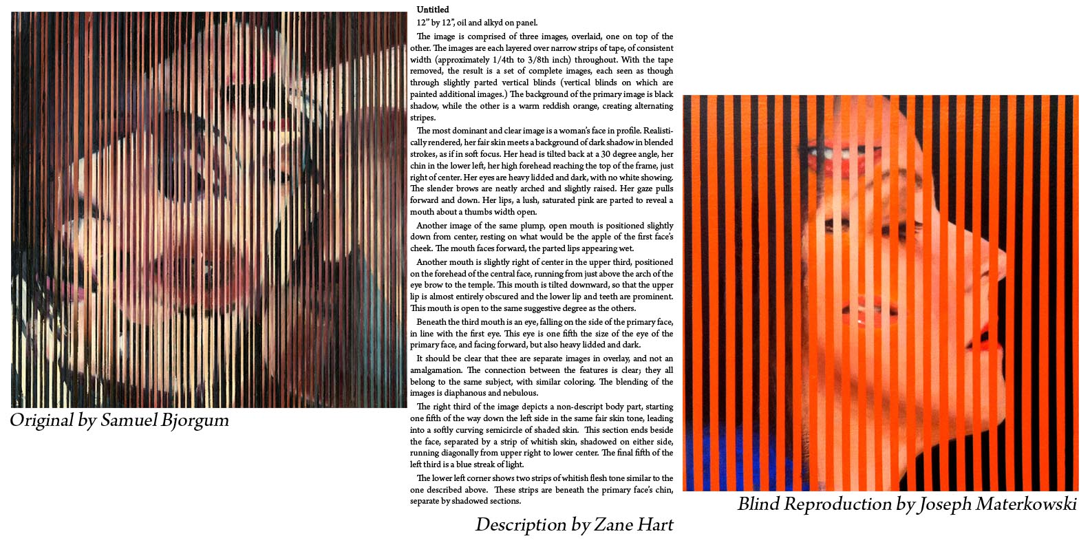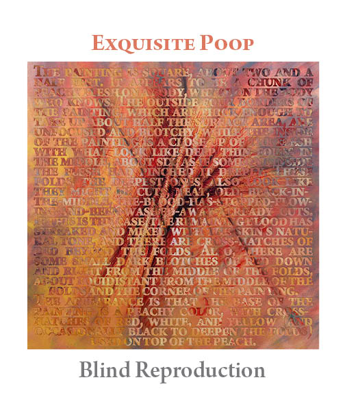 Blind Reproduction is a collaborative art and writing project between 13 artists, 13 writers, and one curator. Sometimes we like to call it Exquisite Poop, combining the names of two less elaborate surrealist party games: Exquisite Corpse and Eat Poop You Cat (the paper game). The artists were invited to contribute one of their smaller two dimensional works, and promise to make another. Images, titles, size and media information were then assigned to the writers, who were charged with describing the art as thoroughly and sincerely as possible, as if the work had been destroyed and needed to be remade, or as if it were being forged. Then, these descriptions were randomly assigned to the contributing artists, with a little tweaking to prevent artists reproducing their own work or that of someone working in media alien to them. The artists were tasked with recreating the artwork they thought the writer had described, without knowing the artist or seeing the original image.