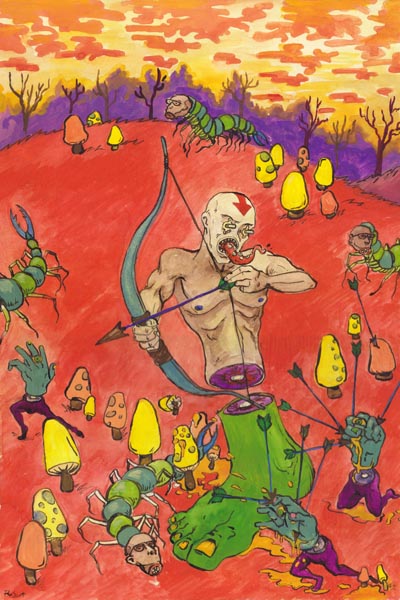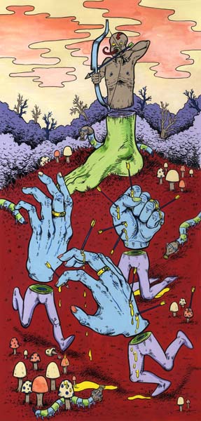 The foreground of the piece is a male creature shooting hand creatures with a bow and arrow. The male creature is in the upper-center of the piece, while the three hand creatures take up the entire bottom half. All of these creatures have their upper half hovering above their bottom half.