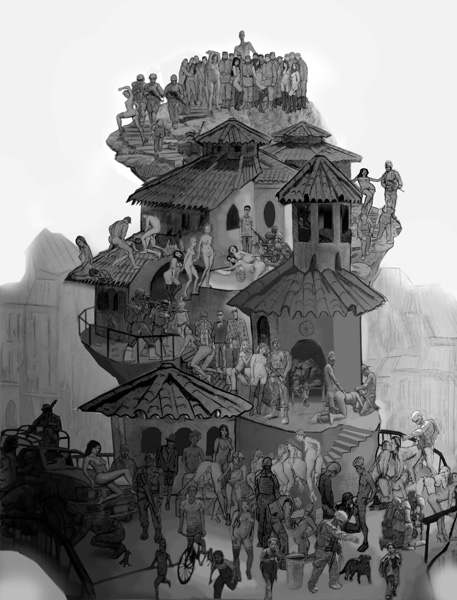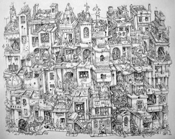 In the mere 16x20 inches that Infamous City spans, viewers are immediately struck with a labyrinthine architecture. The style of this architecture seems to be caught between rustic Italian village and conjoined condominium complexes. The public visibility of the City is reminiscent of a cross between a nudist New York City and the Casbah. The maze of rooms and arcades keeps the viewer moving from unit to unit, a fascinated hostage. This is not apparent until one notices the characters in the drawing that have a truck, and another astride a bicycle. But where to? Beyond the interiors visible, the Infamous City exists as a dollhouse, one room deep, in which the figures are positioned as and in acts of play. This city is floats against a white nothingness. Hallways and arcades are obscured; the drawing seals off this space into its own microcosm. Then again, there is considerable detail in this piece. Empty bottles and birds litter the floors. G- strings and pregnancies are visible. However smudgy, we can pick out individual terracotta tiles that make up the roofs. Men, women, and even a pair of dogs are engaged in all manners of interaction easily inferred.