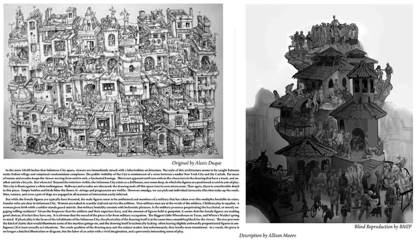 | Alexis Duque “Infamous City” Acrylic on canvas, 20x15in 2010 $2000 | BMIP “Infamous City” Graphite drawing and digital collage, 20x15in hot press print 2011 $2000 |