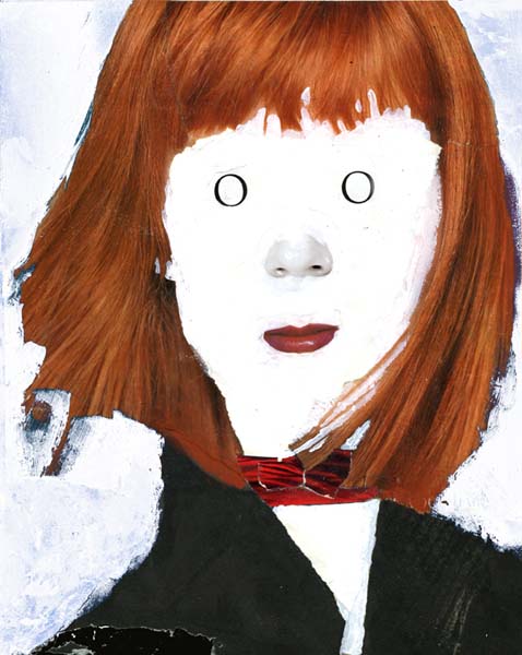 I want you to see where her "red" bangs would be, on her forehead which is simply whiteness, space, nothing, and see the nothingness becoming object itself, and lapping onto the bangs, as if the background was now on top. Like tiny hands as brushstrokes climbing the hair, reaching from where her face should be, to conflate the dimensions and space.