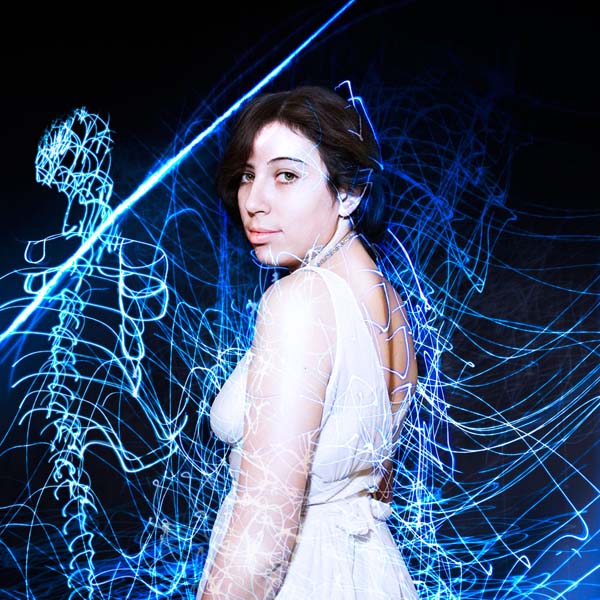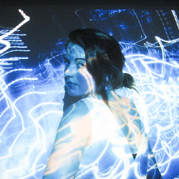 This is a square photograph taken by projecting video onto a scene and photographing the result. The color palette is white, blue and black, with perhaps hints of purple, green and brown, though I may be wrong to infer those. A white, twenty-something brunette girl stands with her back to the viewer. She looks over her left shoulder at the viewer. Her gaze is one of patience tinged with reproach. She has been standing, one senses, for a long time. Her eyebrows are high and thin with a gentle arch; her nose and lips prominent, her eyes and lashes large. She wears a white v-backed shift and a necklace. We can see only her upper body terminating just above her elbows, which are at her sides. There is blue-black at the top of the picture and in the girl’s loose bun; a diagonal band from middle left to mid-top right of blue-white overtakes the middle; the bottom right corner has a bit of blue. White exposure squiggles--like sloppy cursive over the woman's body, and one a bit like a skeleton torso or a hat-tree on the left--cover and perhaps compose the diagonal band. The top quarter is predominantly dark; the bottom two thirds are predominantly light. She stands in the middle of the scene. The top of her head is about a seventh from the top of the square.