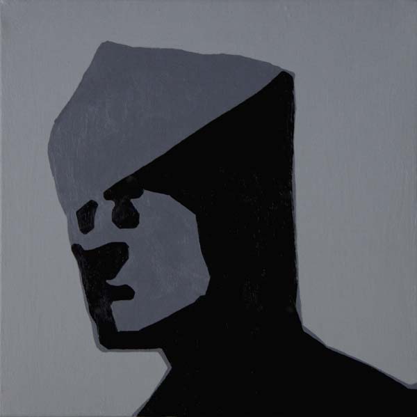 It is an almost side profile of the subject. He is turned slightly towards the viewer. The bottom right hand corner is the start of the subject’s upper portion of his left shoulder, and just beyond the middle of the canvas is where the upper portion of the subject’s chest is. This portion is painted in black, and all the black is connected together except around the subject’s right eye. That piece floats alone on Gray #2.