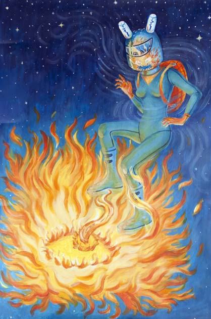 The bottom half of the painting contains a giant, mostly square-shaped ball of fire, with countless flame tendrils swirling around and upward like the short branches of some dense, orange bush. In the center of the ball of fire, slightly to the lower left, is an upward-looking eye, also made of fire but slightly brighter than the rest, with a stream of flame flying up out of the pupil, lapping at the underside of the raised boot of a girl in a tight-fitting space suit of sorts. It clings tightly to her, but seems a little looser around the torso. There are a few seams around the arms. The boots run to mid-calf. On her back is some sort of backpack-type pouch with the hatched texture of a honey-baked ham.