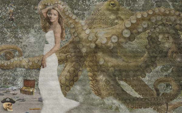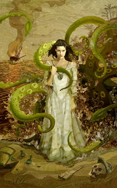 The image shows a woman in a white dress, perhaps a wedding gown or a medieval noblewoman's gown, wearing a green, heart-shaped locket with a keyhole in it. It dangles below her breast. Her skin is pale and her hair, blowing behind her in the breeze, is dark; she stares out from under a determined brow, looking at a point just over the viewer's right shoulder. Her own right hand is reaching up to clasp the green tentacle that wraps around her from behind. She's standing on the seashore, exactly where the waves hit the beach; immediately behind her, a green sea monster, perhaps a kraken, bursts out of the water, its tentacles surrounding her in a halo. In front of her, on the beach, lies a wooden plank, a few bottles, and a pirate-hatted skull. The top of a buried treasure chest protrudes from the sand.
