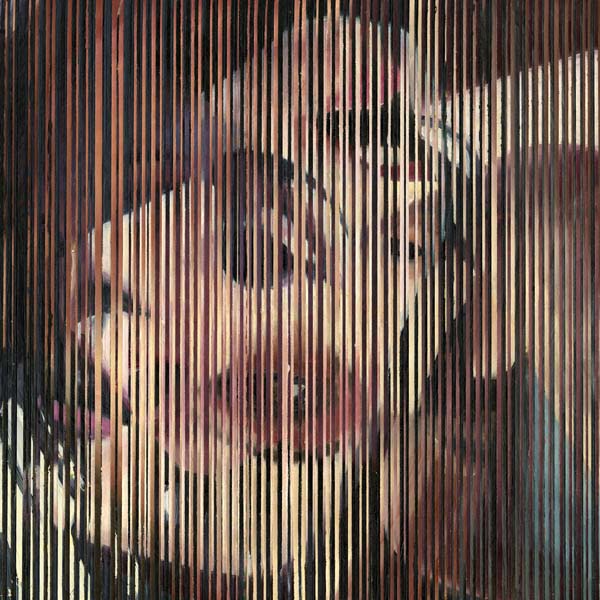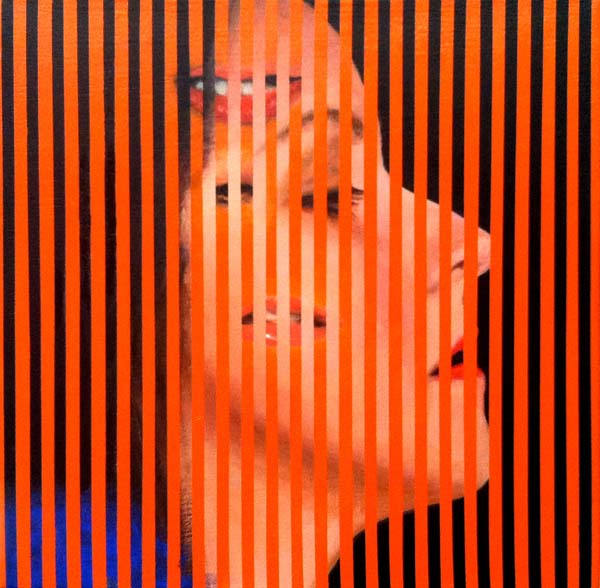 The image is comprised of three images, overlaid, one on top of the other. The images are each layered over narrow strips of tape, of consistent width (approximately 1/4th to 3/8th inch) throughout. With the tape removed, the result is a set of complete images, each seen as though through slightly parted vertical blinds (vertical blinds on which are painted additional images.) The background of the primary image is black shadow, while the other is a warm reddish orange, creating alternating stripes.