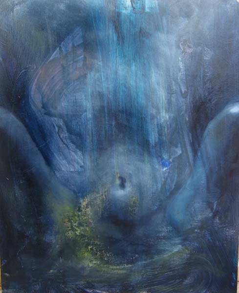 The image has a palette of deep blues. Its texture is characterised by broad brush strokes, most notably a large vertical stroke that is one third the width of the image, is central and stretches from the top of the image to the mid point. To the left of this streak are two arc like strokes. Very crudely, one could be described as a parabola, the other a hyperbola. The two arcs intersect at their apexes. The major line of axis lies perpendicular to the broad central stroke, so the arcs form a handle to it, like a mug.