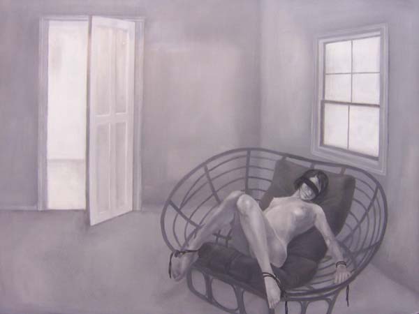 | Lorra Jackson Untitled Oil on canvas, 12x18in 2011 $2000 | Nick Musaelian “Woman on a Double Papazan from Pier One Imports” Oil on canvas, 18x12in 2011 $1000 |