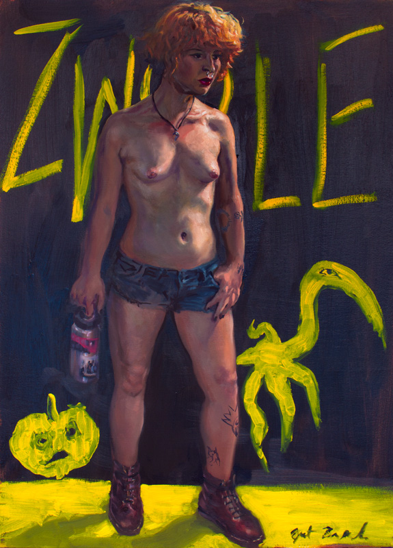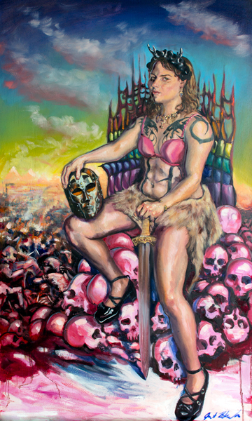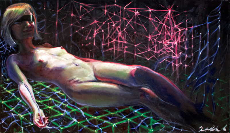 The title of the series is neither a literal reference to mythology or astrology, but an embrace of mutability, deriving from alchemical concepts of Mercury as the mother of metals and the element of fluidity. Minds, bodies, and society can and should change; culture, artifice, and shifting images are truth. Oil painting works as a kind of magic transmutation from metal and organic pigment into a projection of living personality. Through old technology and hybrid imagery, Daughters of Mercury invokes the possibilities of better living through chemistry, medicine and speedy communication, and a more cyborg feminist future.