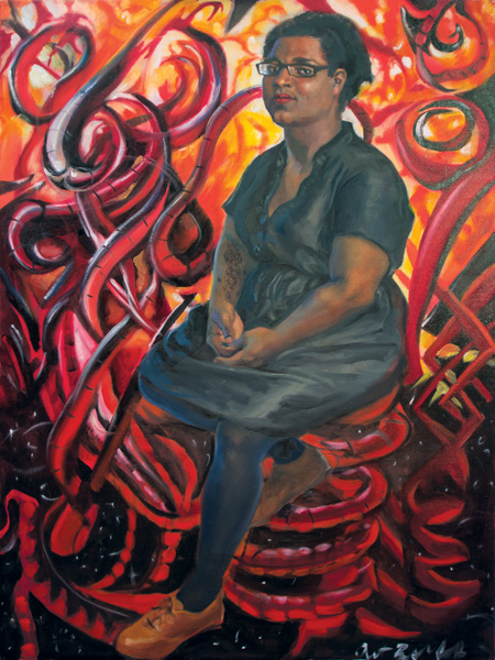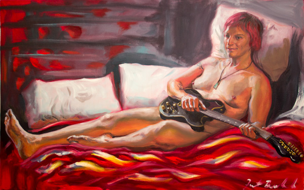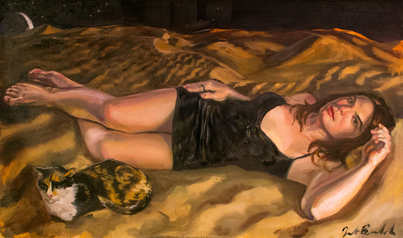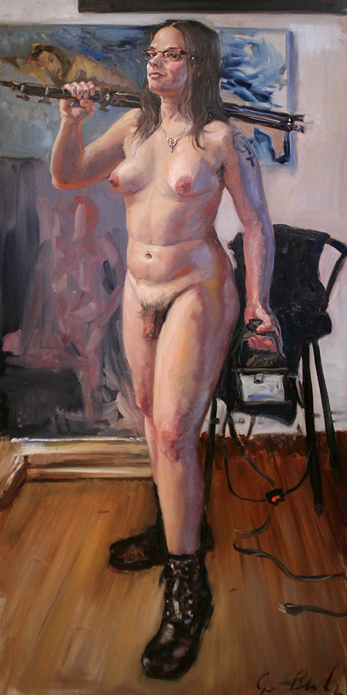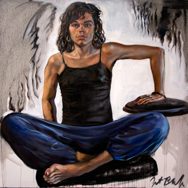 Many of the portraits are nudes, or near so, because subject and artist wanted to engage with the historical tropes of the medium and its relationship to depictions of female bodies. Exposure levels are a reflection of the subject’s love for and feeling about their body. It engages the ways women look at women, not an elimination of sensuality but an expansion and complication. Using oil paint on canvas and (non-continuous) poses, often as long as 12 hours, not only conceptually elevates the subject, but allows for conversation and invention outside the dynamic of the photographic standard.
